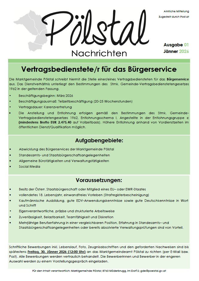 Stellenausschreibung "Vertragsbedienstete/r für das Bürgerservice" der Marktgemeinde Pölstal